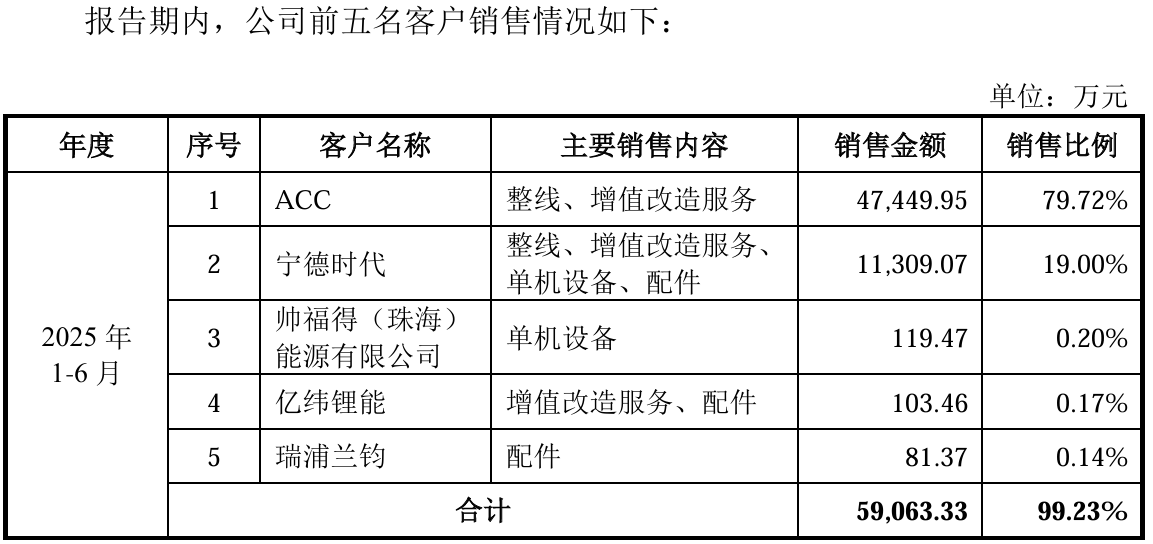 恒翼能的业务扩张表现出显著的依附性特征。报告期内,公司前五大客户收入占比从高位进一步攀升至2025年上半年的99.23%。尽管从客户名录看,公司实现了从宁德时代(300750/03750)向海外客户ACC的切换,但这种更替主要围绕头部产业资本的扩张路径展开,而非基于市场广度的实质性突破。